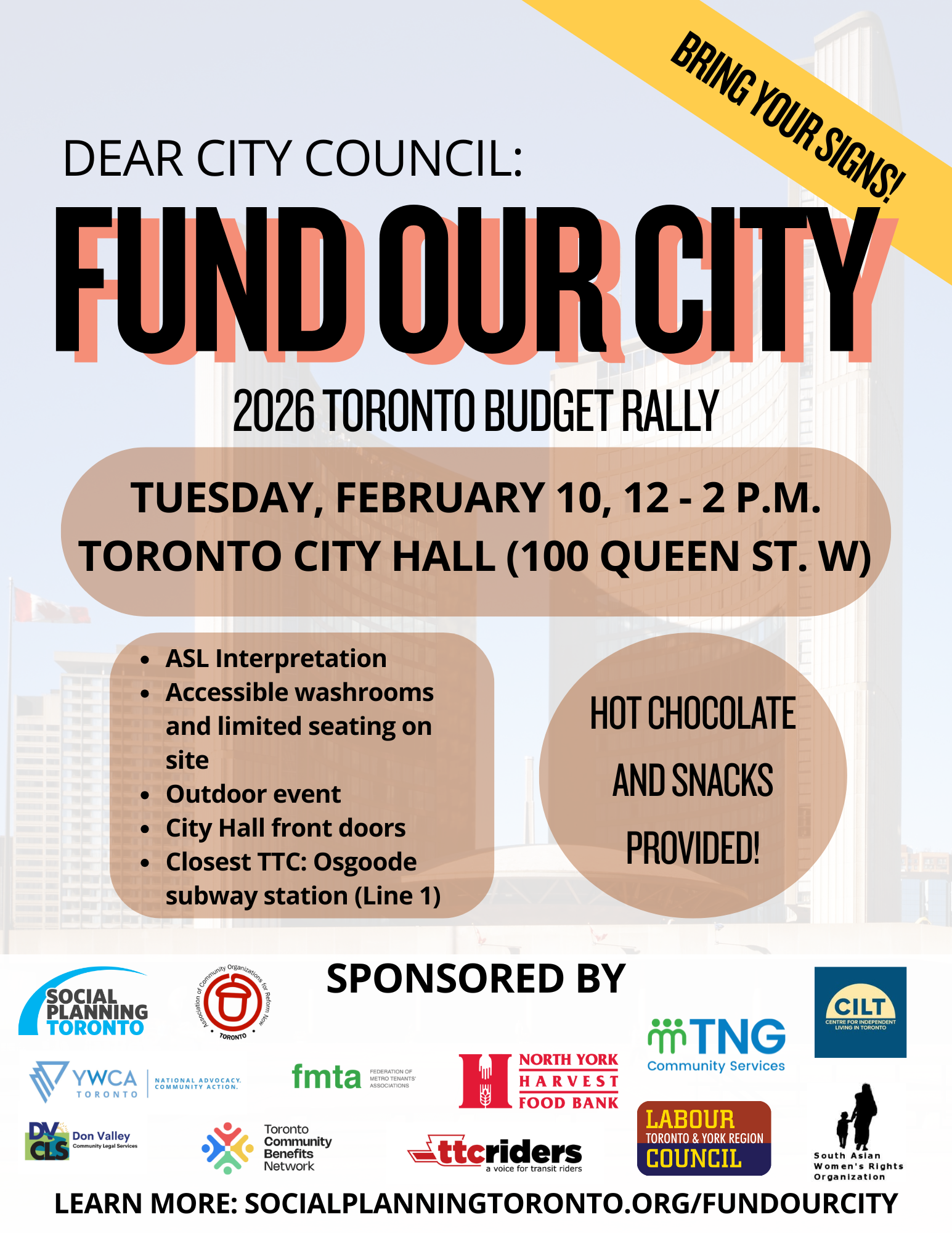 - Join Social Planning Toronto and community partners at the Fund Our City rally at Toronto City Hall (100 Queen Street West) on Tuesday, February 10 at noon! RSVP here.