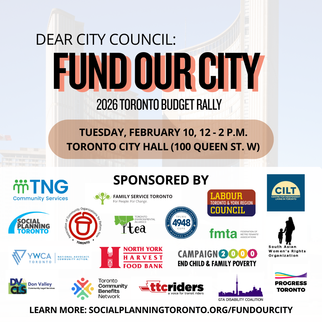 On February 10, Toronto City Council will be voting on the 2026 City Budget. Social Planning Toronto and partners are organizing a community rally outside City Hall to let Council know this is no time for cuts.